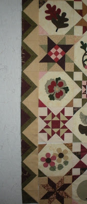 I have two more blocks to applique and then I need to attach the corners to those blocks and can continue to sew the rows together. It is really starting to look like I might get this one done sometime in the next few months, I think I will keep it on design wall until the top is finished. The border looks to be fairly easy to piece, the only other thing that will take a little time is the tree that I need to put in the center and cutting the 55-60 wool leaves and appliquing them to the center.